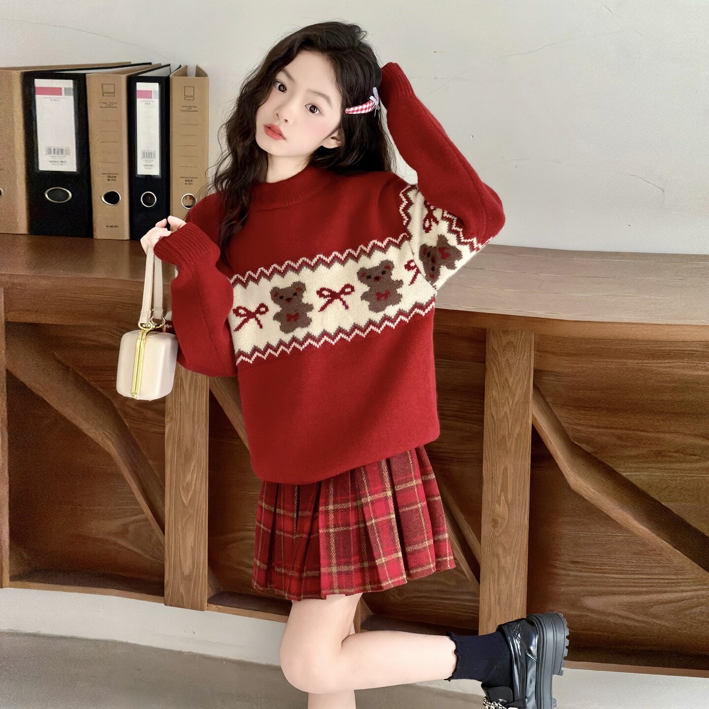 女童新年款小熊毛衣秋冬2026新款小女孩红色保暖儿童针织衫套装裙