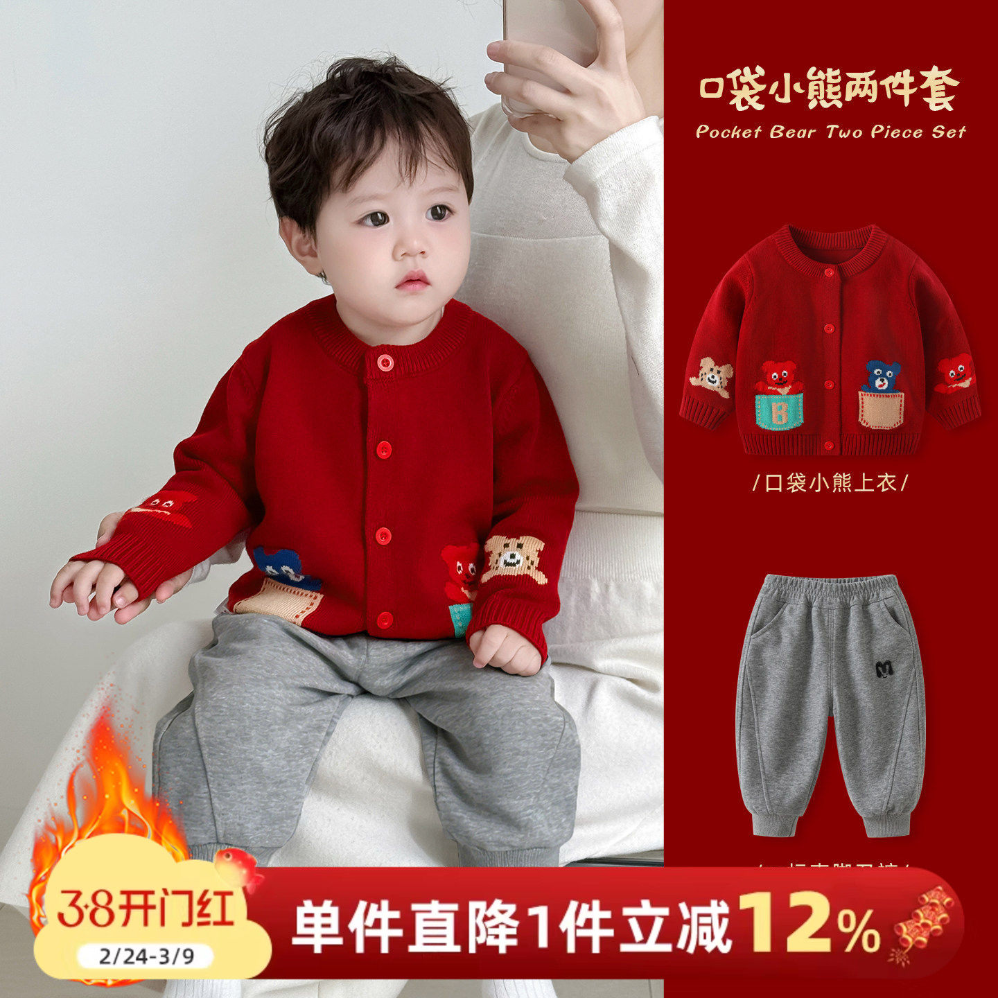 男宝宝套装秋冬婴儿针织外套加绒女童红色喜庆衣服新年拜年两件套