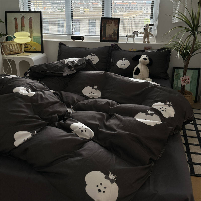 北欧风ins黑色奶凶小狗水洗棉床单被套四件套学生宿舍单人三件套
