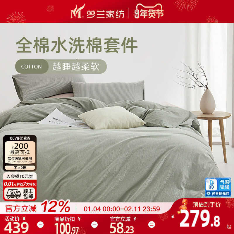 梦兰家纺全棉水洗棉床单被套四件套学生宿舍单双人纯棉三件套床品