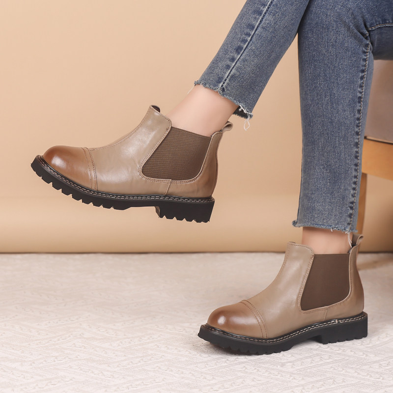 厚底英伦风切尔西靴时尚圆头百搭单靴裸靴平跟马丁靴秋冬保暖大码