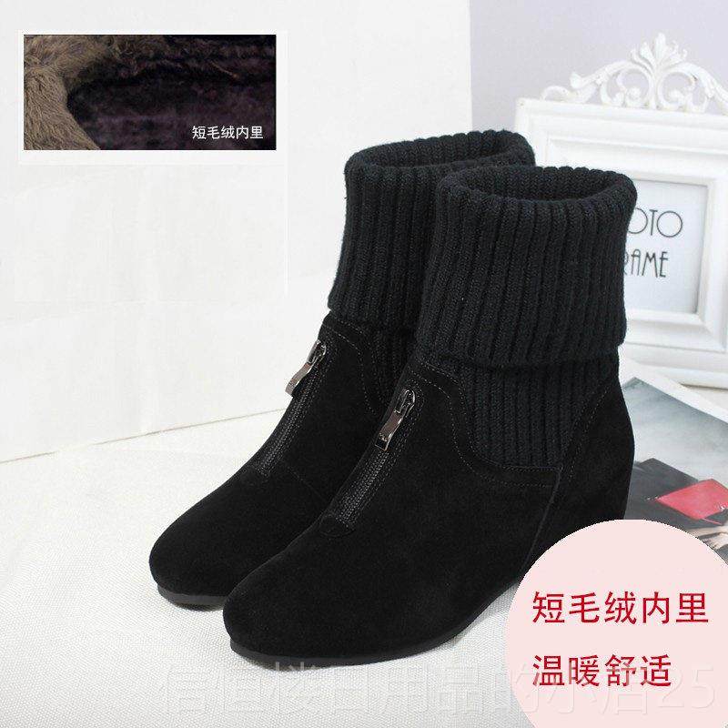高档秋冬跟毛线短靴内增高磨砂女靴码真皮裸靴中底坡平跟棉大鞋女