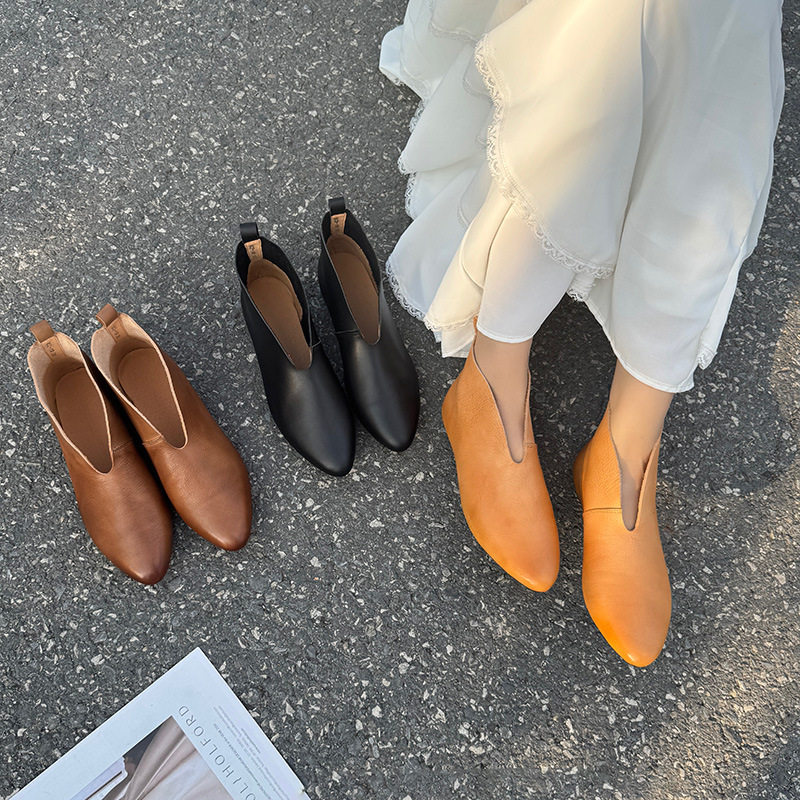 禅意简约手工真皮小短靴女头层牛皮尖头套脚平跟裸靴休闲低跟单靴
