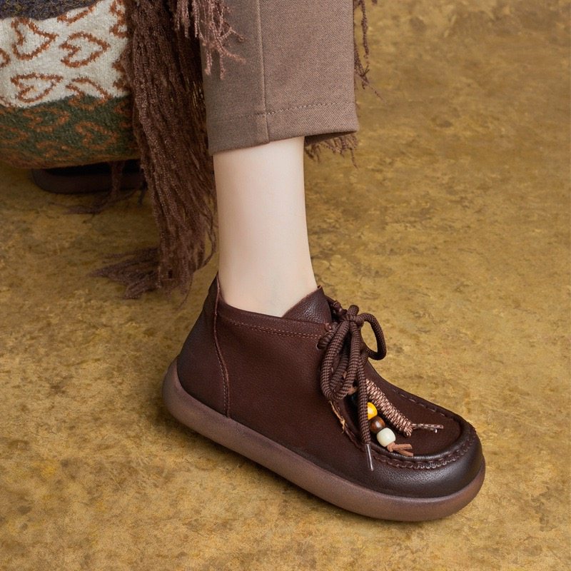 2025秋冬新款复古真皮圆头系带平跟短靴高帮鞋单靴裸靴休闲袋鼠靴