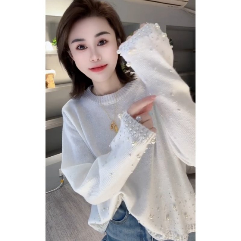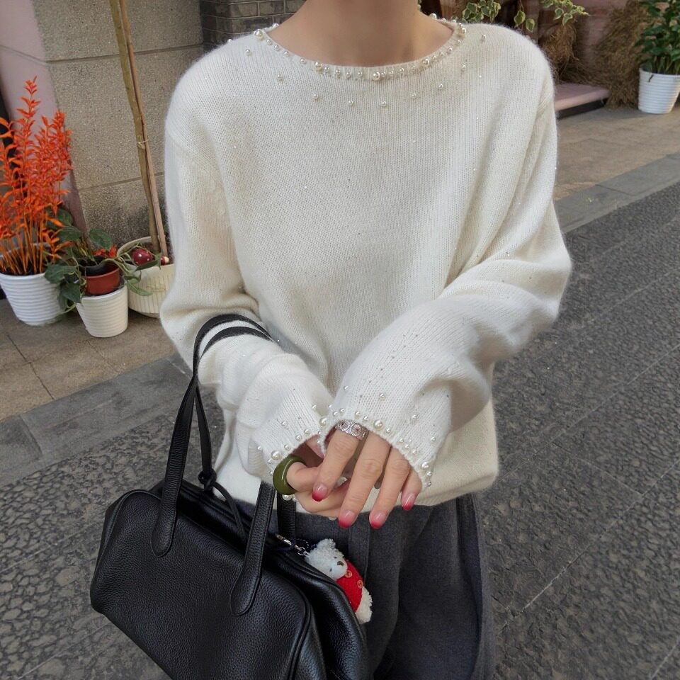 欧货重工烫钻珍珠长袖针织衫女2025冬季新款高级宽松慵懒套头毛衣