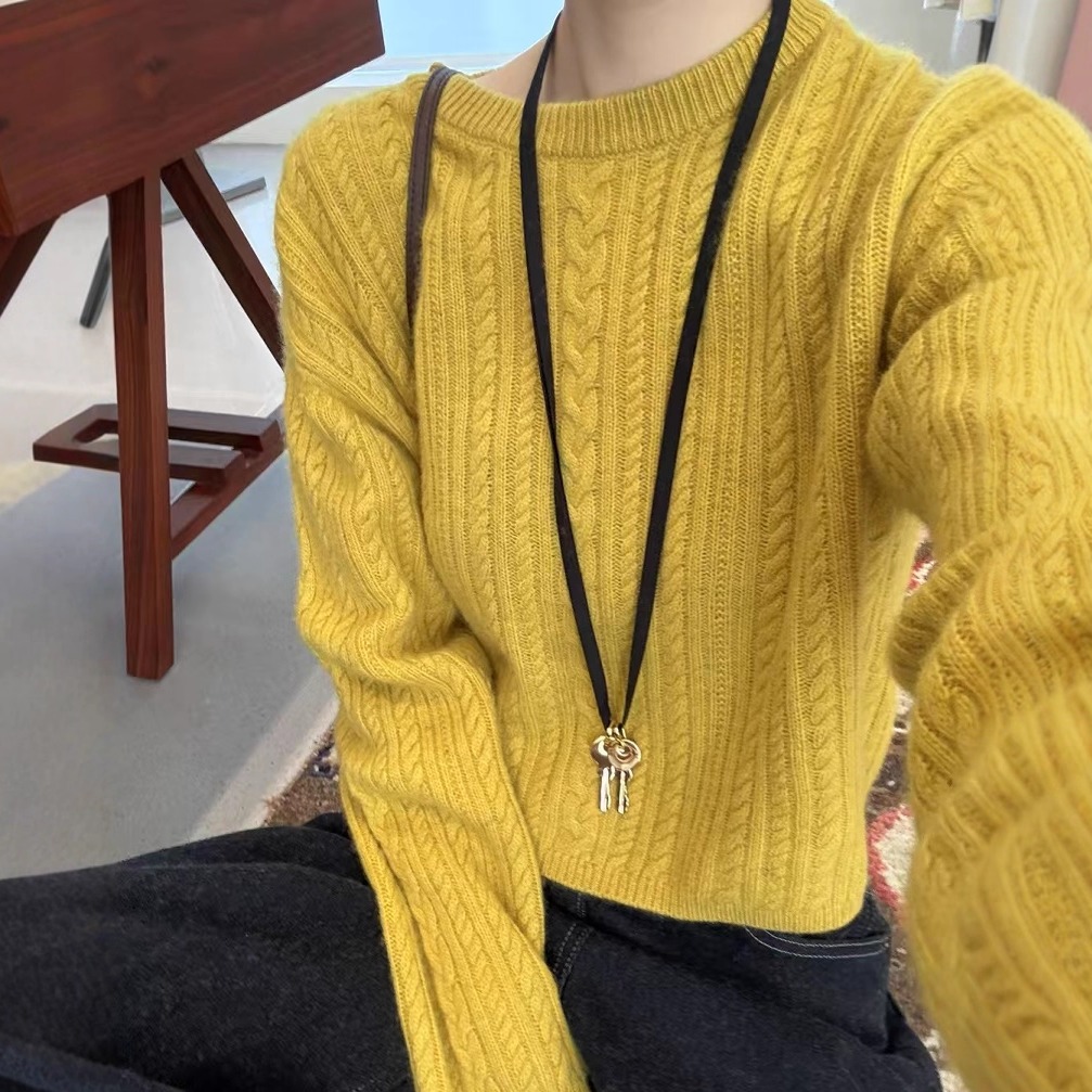 欧洲站2025秋冬新款休闲复古圆领麻花纹羊毛毛衣女套头宽松针织衫