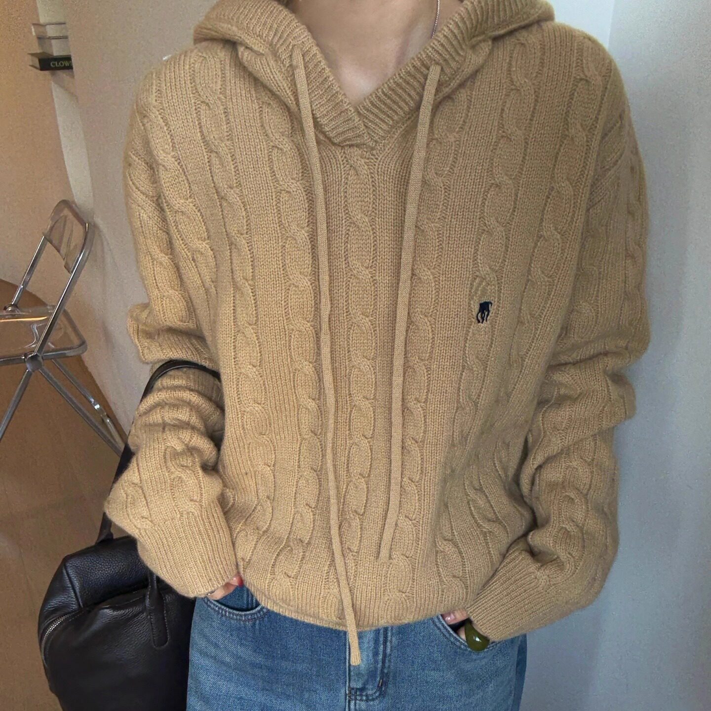 欧洲站2025冬装新款休闲复古麻花辫连帽羊毛毛衣女宽松套头针织衫