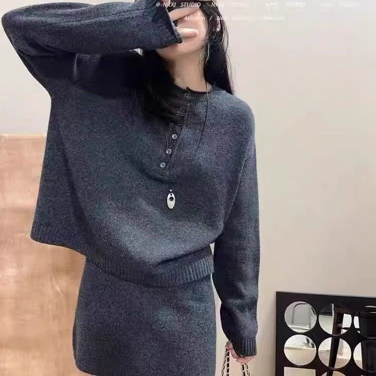 欧洲站2025秋冬新款欧货女潮排扣宽松套头羊毛衫+针织短裙两件套