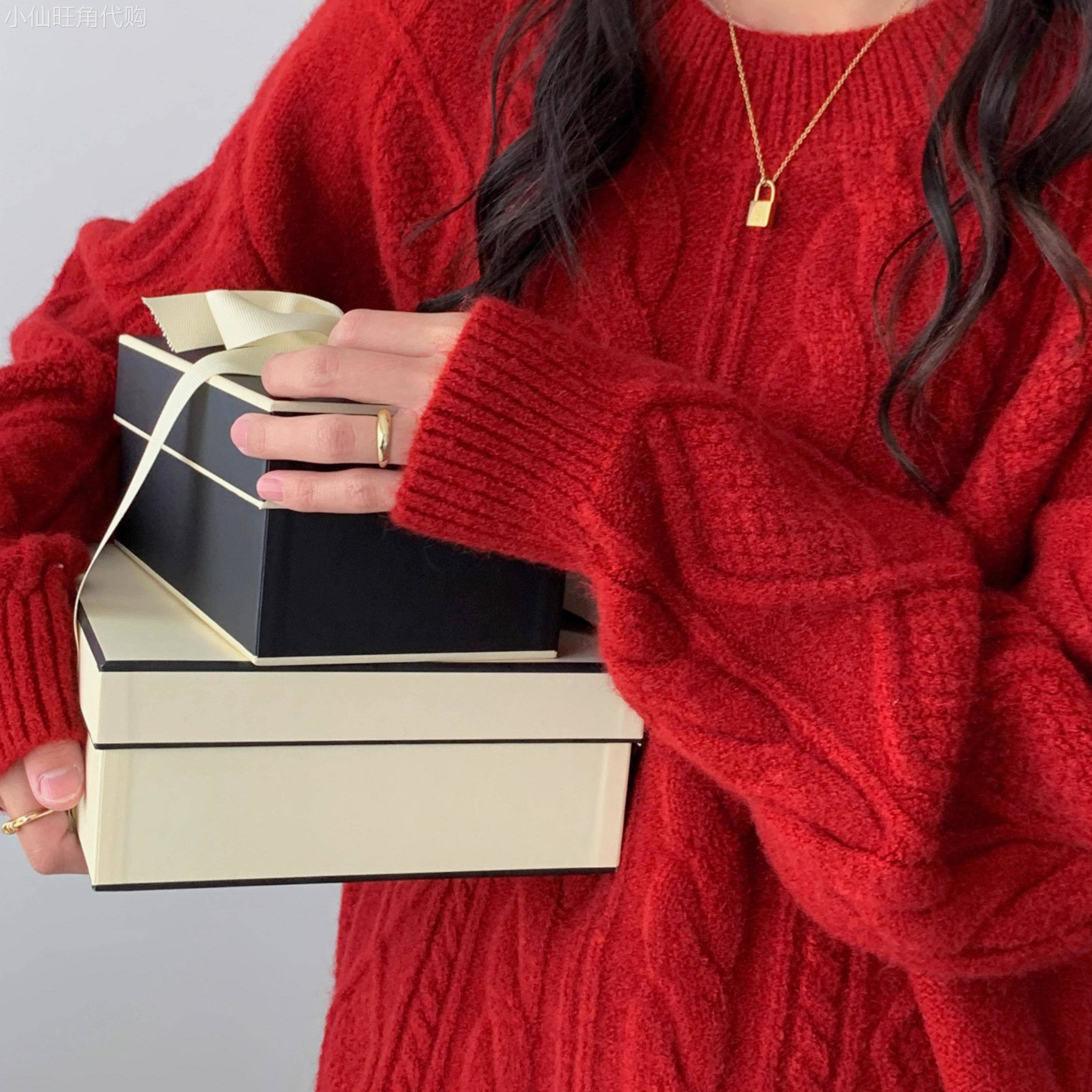 欧洲站红色麻花圆领套头毛衣女2025秋冬季宽松软糯针织衫加厚保暖