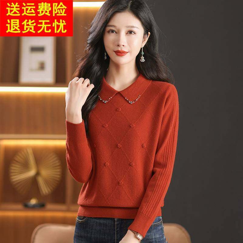 套头POLO领毛衣打底针织衫100%纯羊毛女秋冬宽松大码贴钻上衣春装