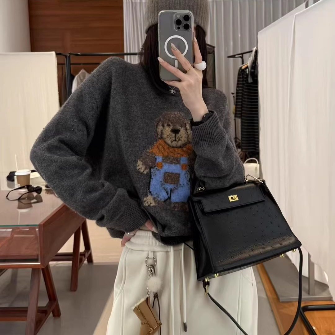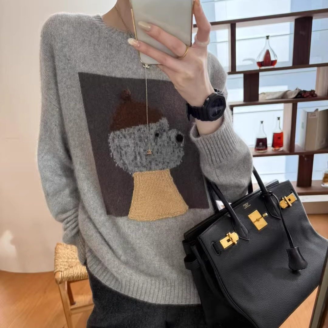欧洲站2025冬装新款欧货刺绣卡通圆领羊毛毛衣女宽松套头针织衫