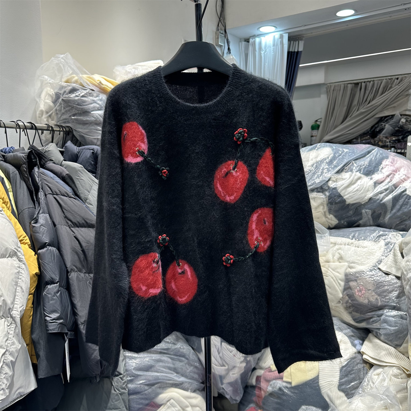 欧洲站2025秋冬圆领套头时髦樱桃刺绣宽松羊绒拉绒套头宽松毛衣女