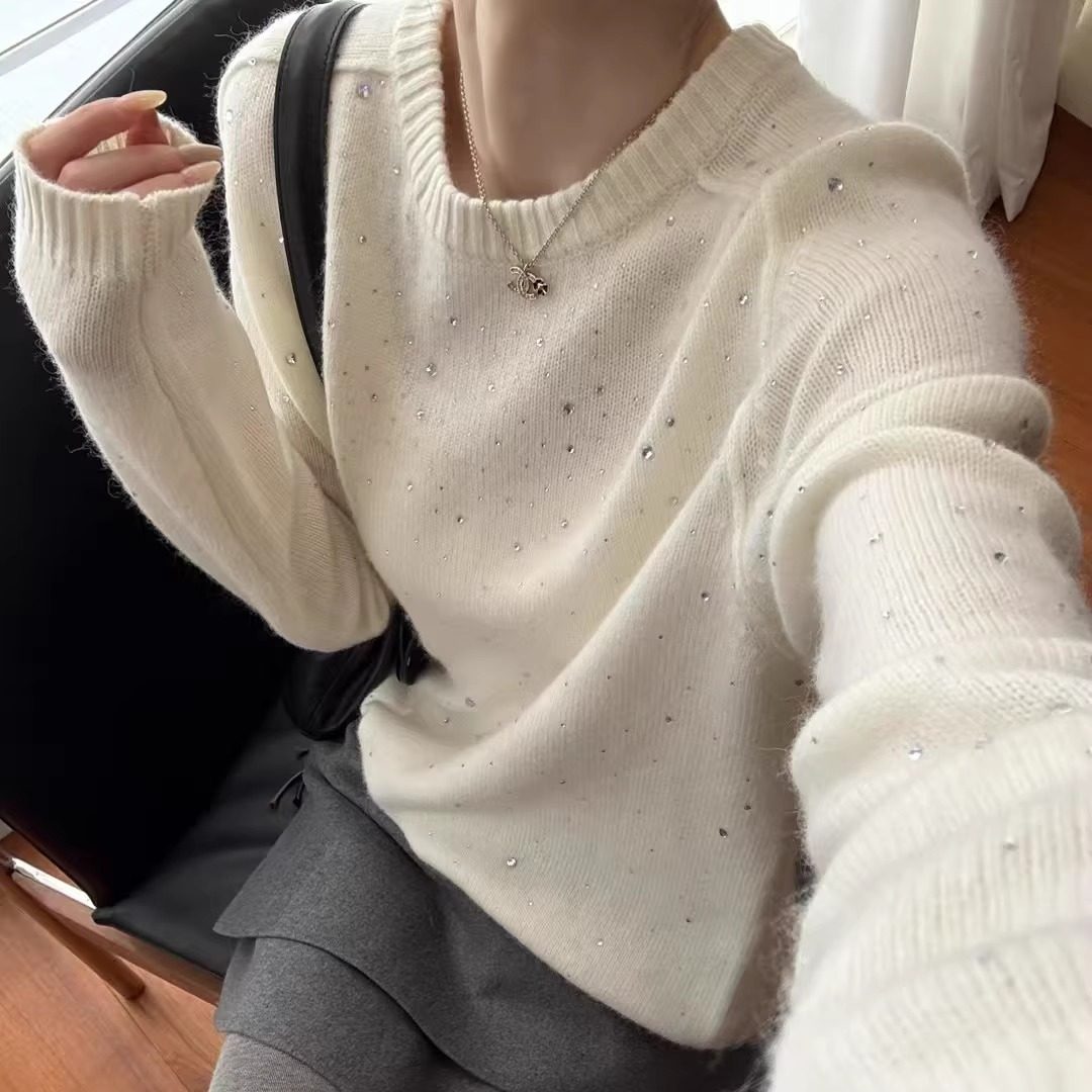 欧洲站2025冬新款纯色套头圆领重工烫钻宽松显瘦保暖山羊绒毛衣女
