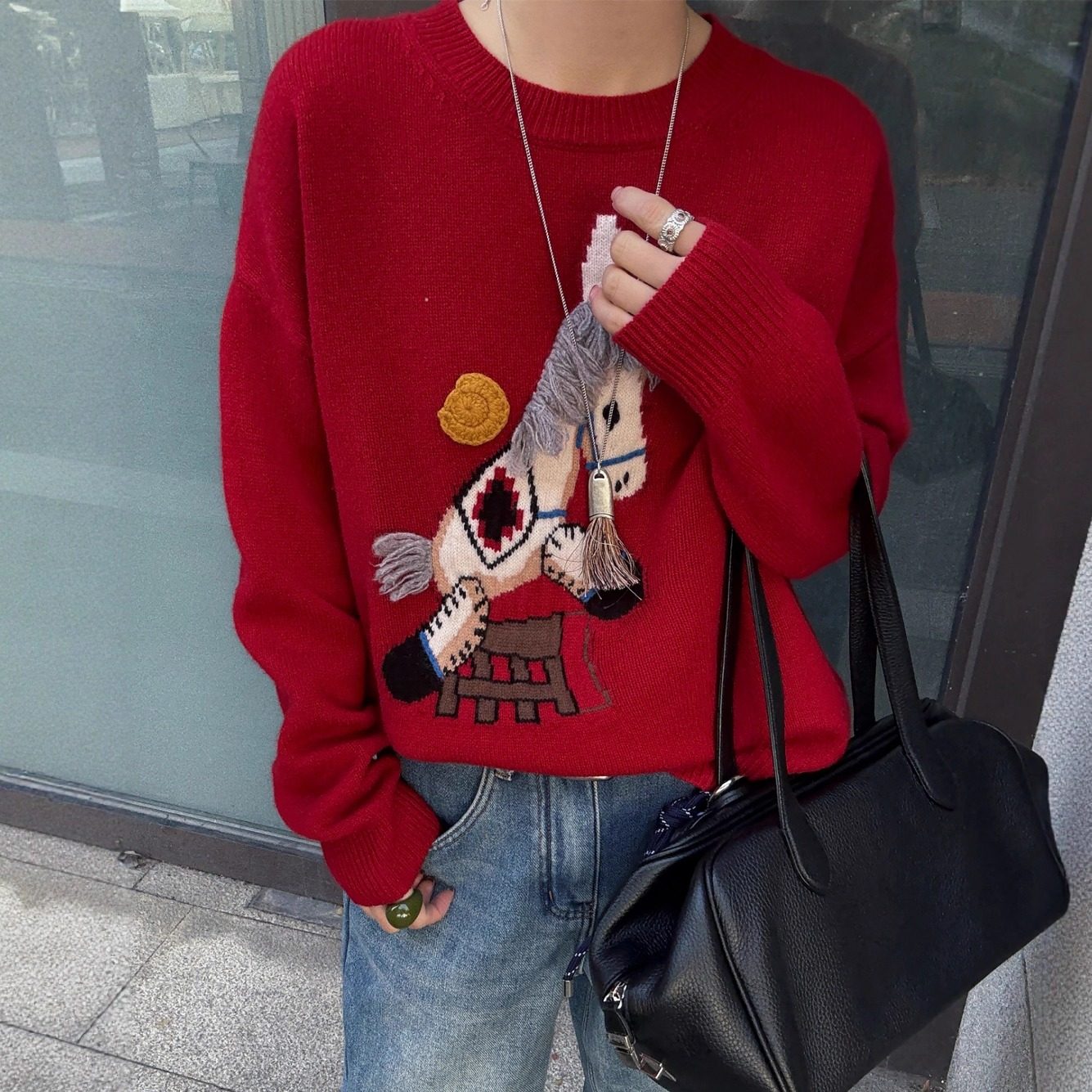 欧洲站2025冬季圆领宽松落肩袖重工小马提花羊毛针织衫套头毛衣女