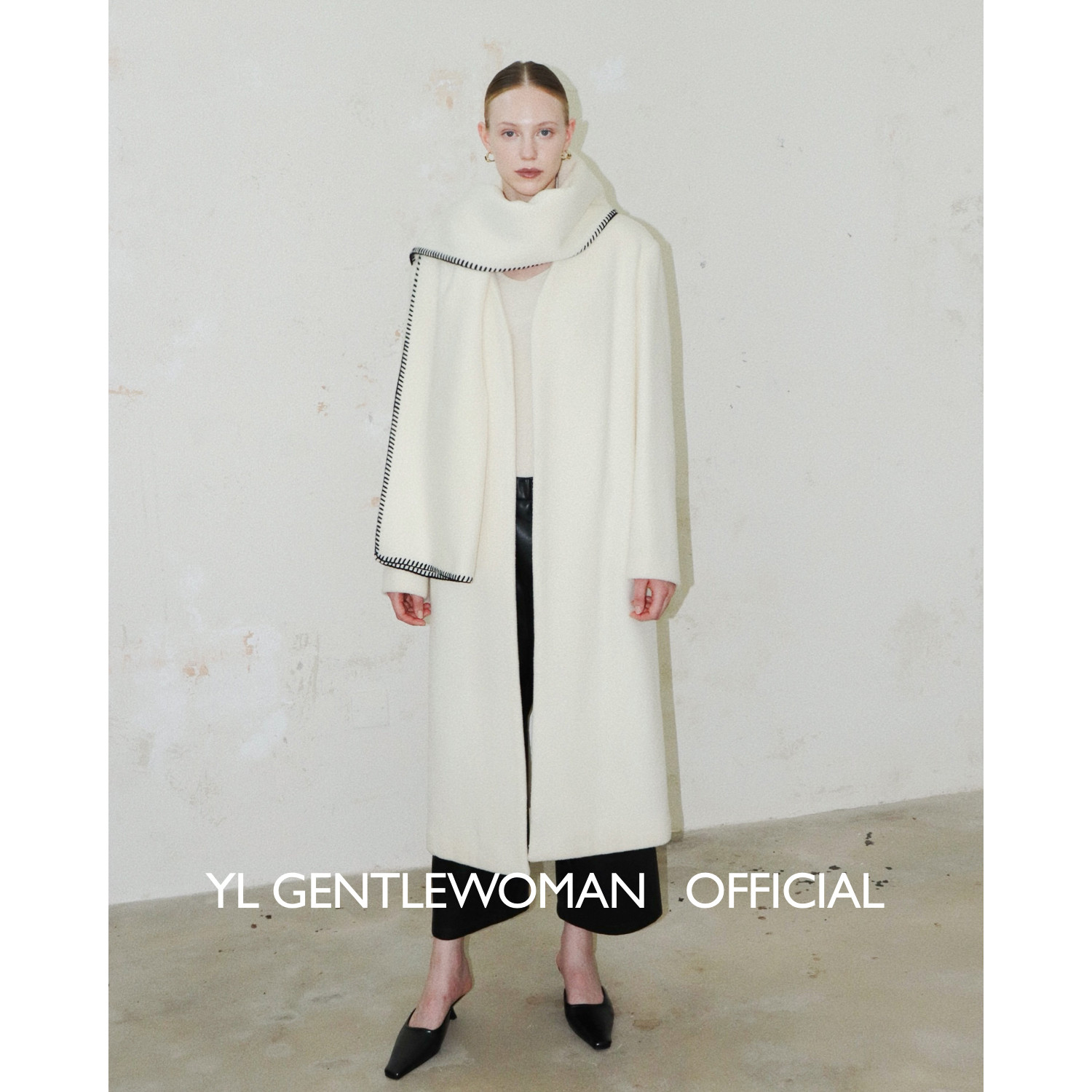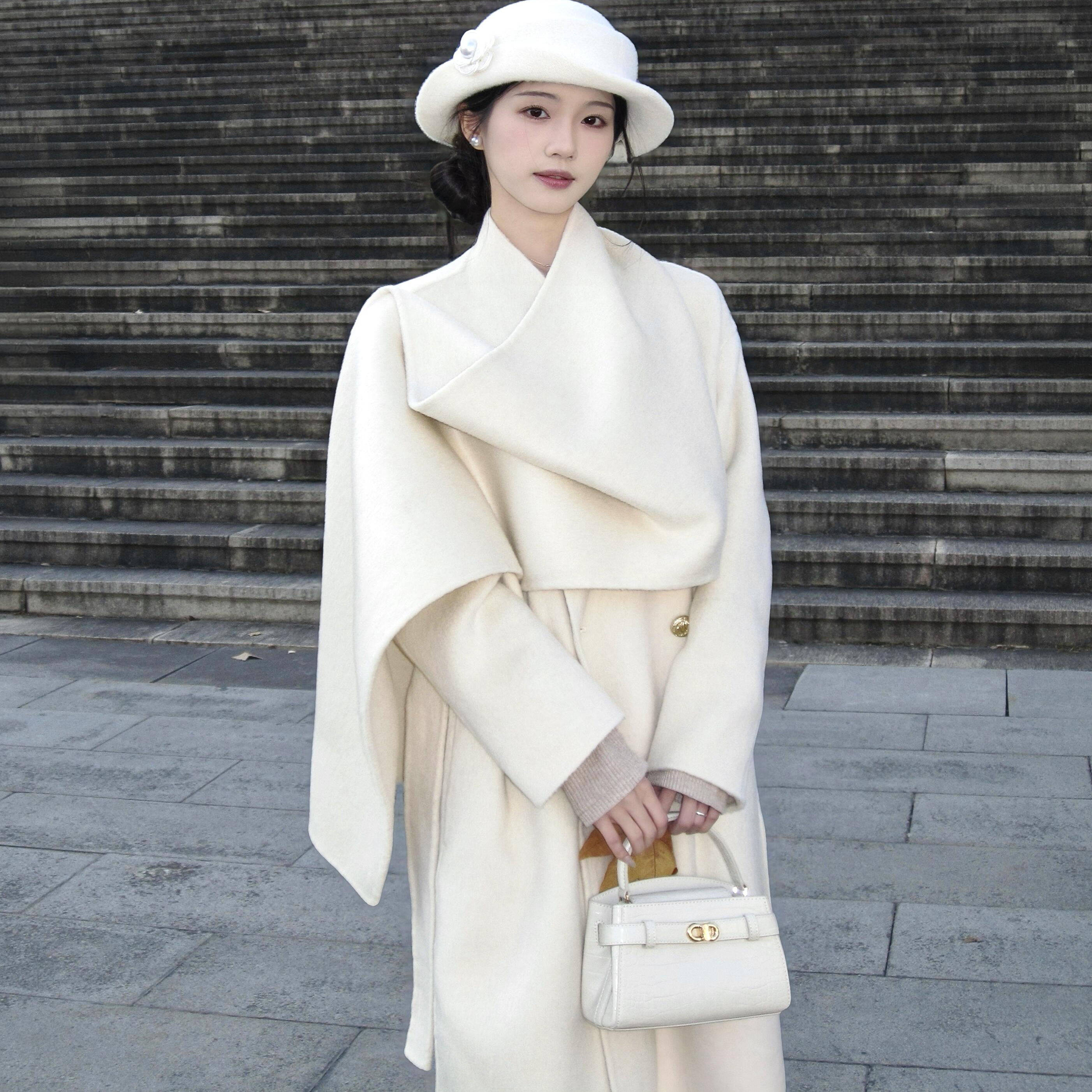 YL Gentlewoman双面呢羊毛白大衣显瘦西装无领外套|大披肩围巾