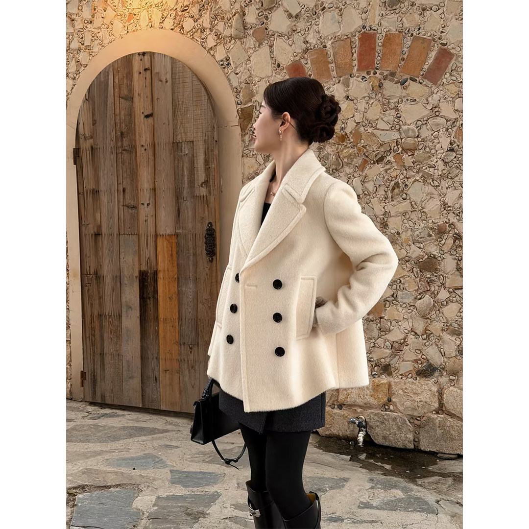 100%绵羊毛秋水伊人白色翻领大衣2025年冬季新款通勤慵懒毛呢外套