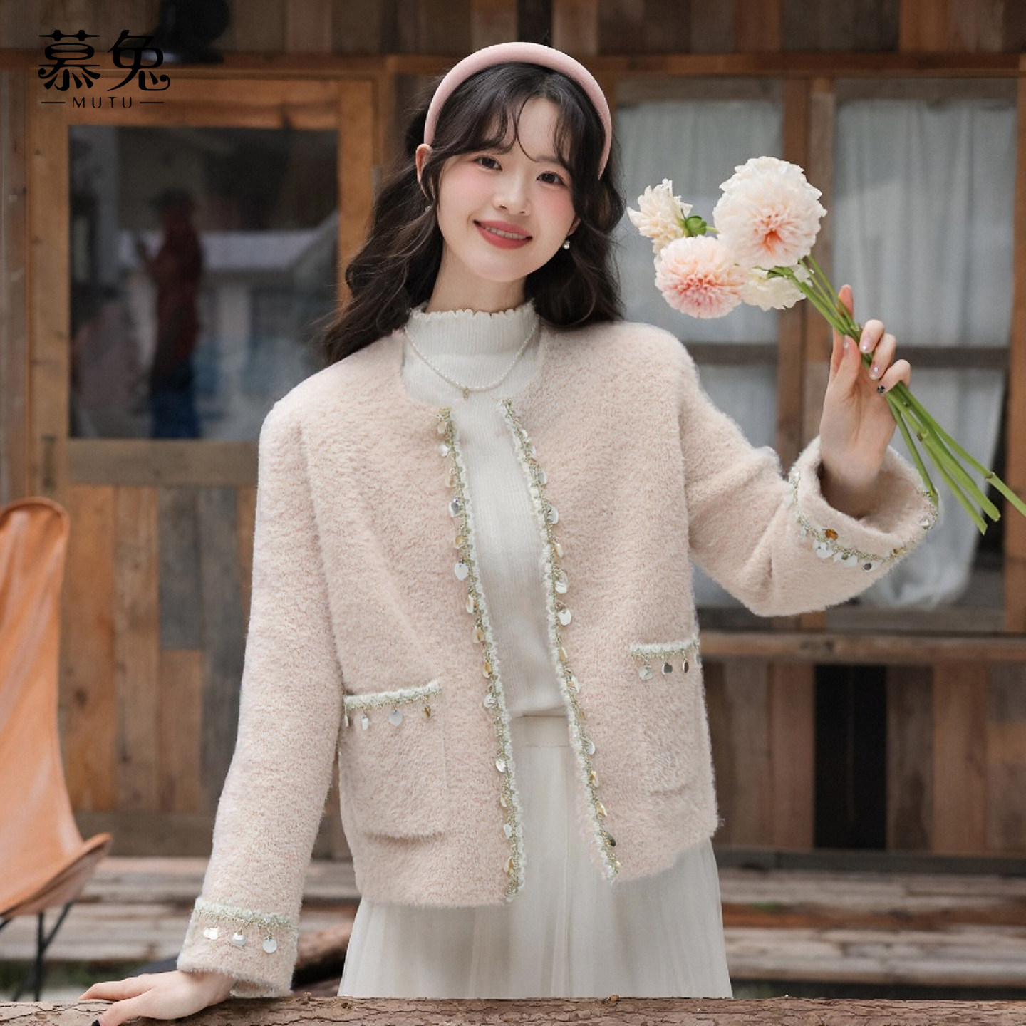 慕兔甜美小香风流苏毛衣外套女2025冬季新款小个子宽松针织衫上衣