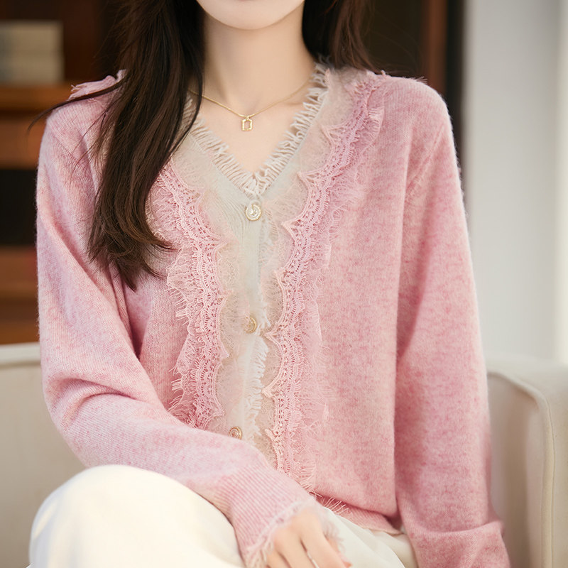 25秋冬100%纯羊毛开衫女V领蕾丝流苏毛衣外套宽松钩花羊绒衫长袖