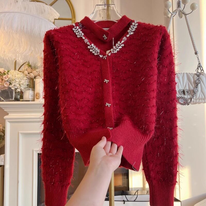 冬季新款复古红色洋气羊绒流苏毛衣外套女装挂脖镶钻重工针织开衫