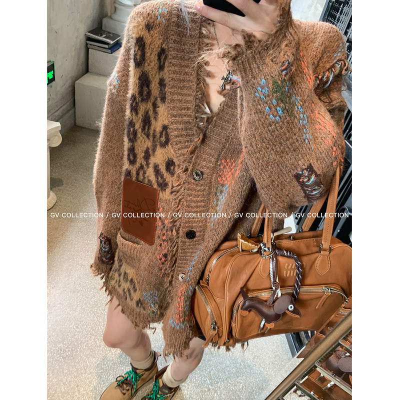 GV大白哥 重工皮标 破碎流苏加厚撞色毛衣宽松开衫冬季外套女