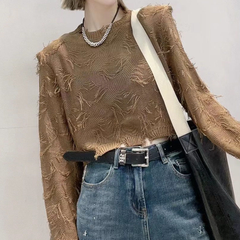 MAMC漏肩破坏流苏毛衣女款2024慵懒高级感秋季新款宽松针织衫上衣