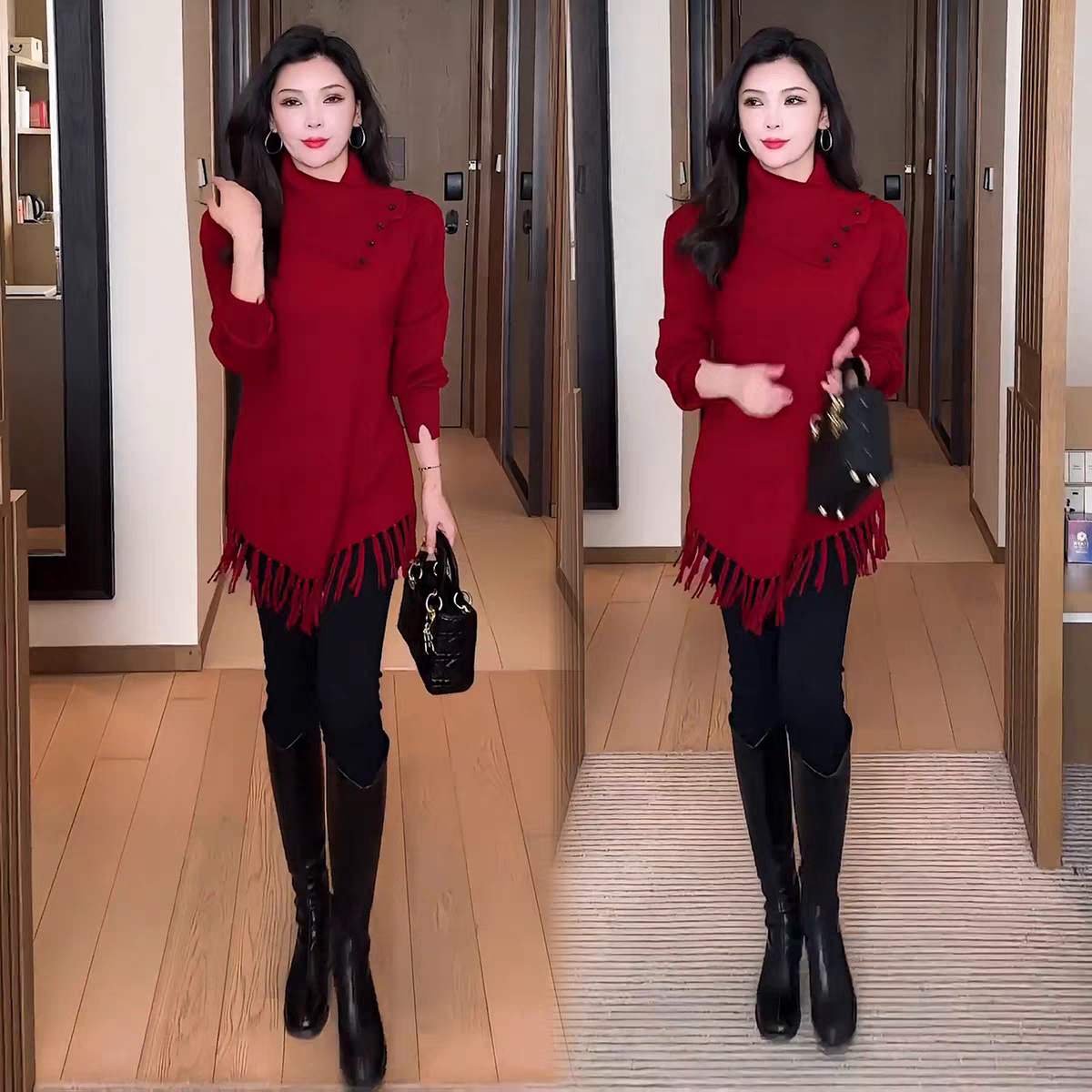 秋冬半高领羊毛衫女士中长款流苏毛衣宽松大码遮肚针织打底衫上衣