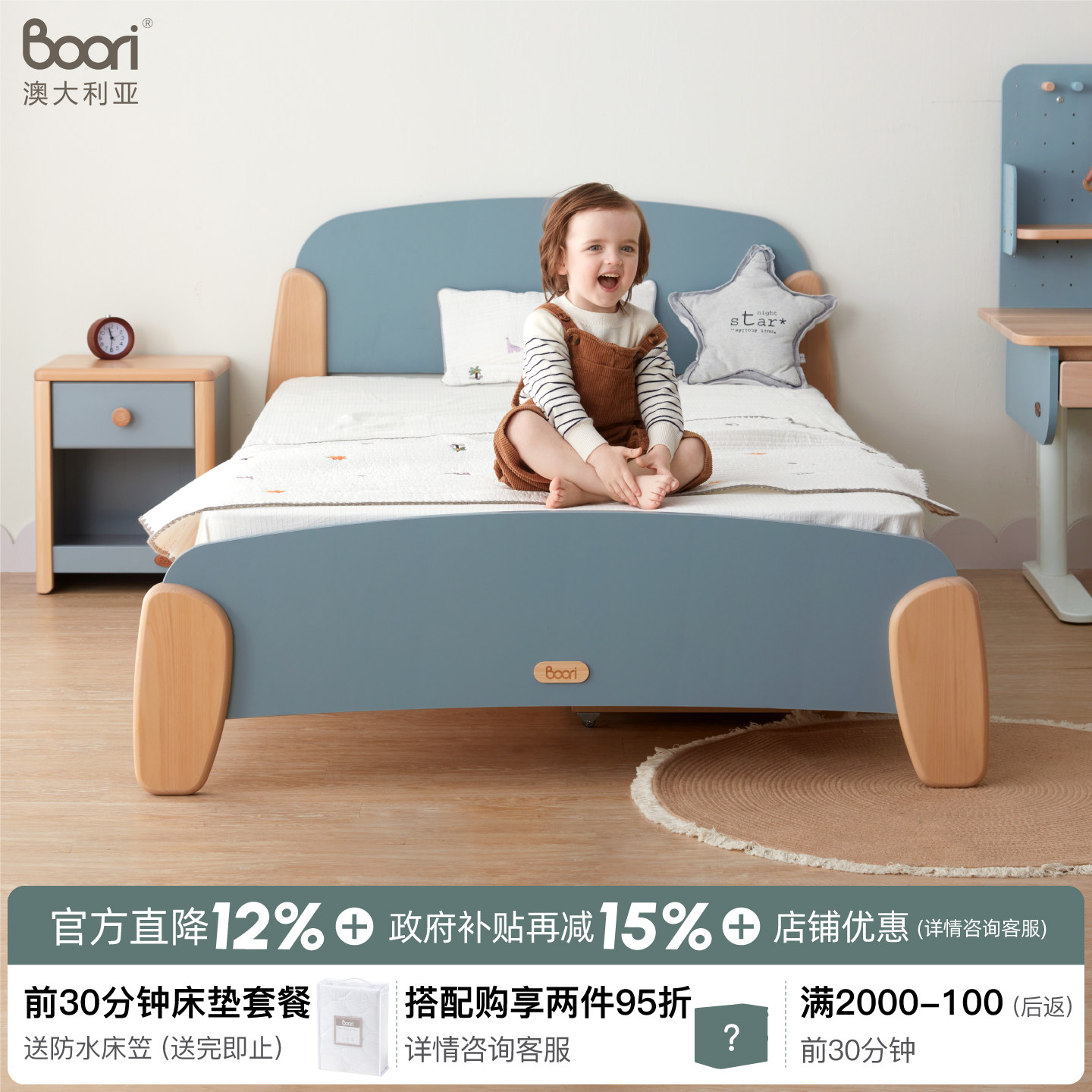 Boori Sunshine森莎进口实木男女孩双人床1.2米单人床卧室儿童床