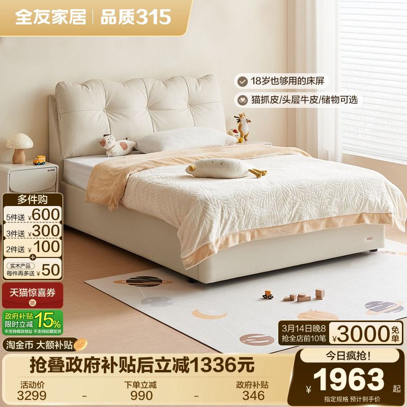 全友家居奶油风猫抓皮儿童床1.35米小户型卧室储物床1.2米单人床