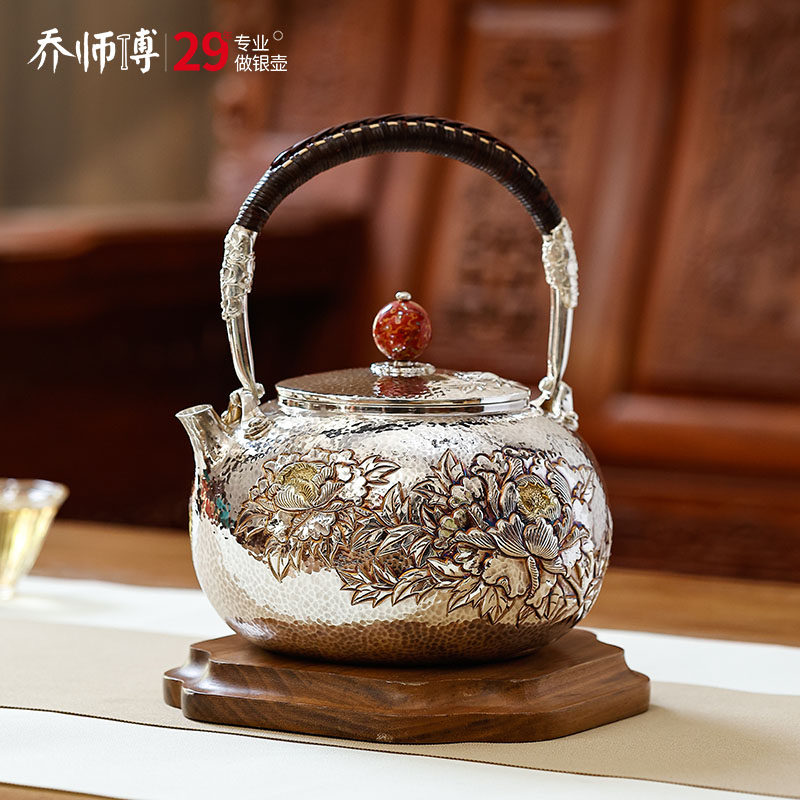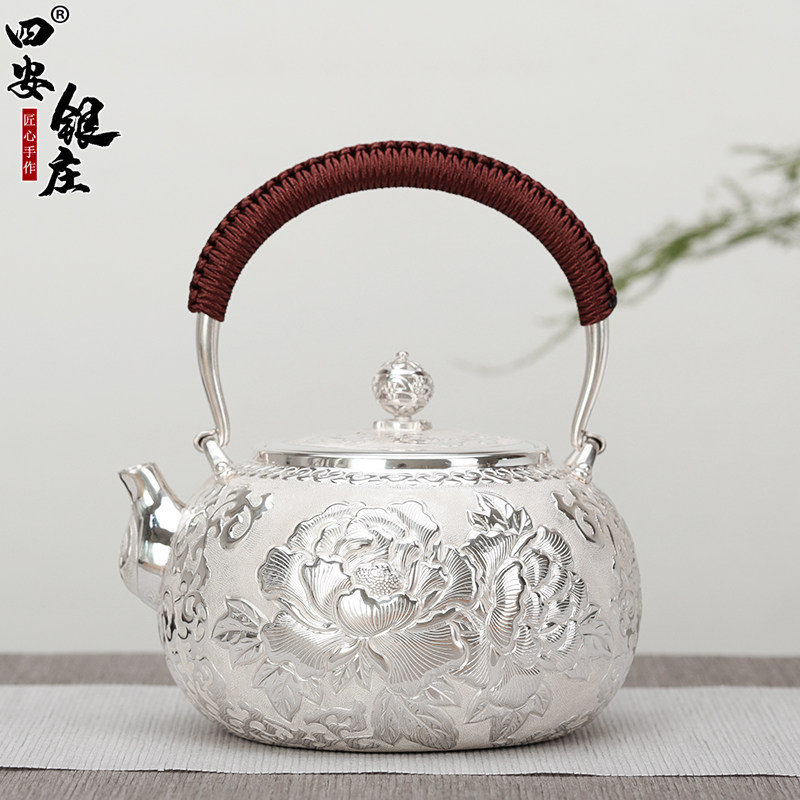 四安银庄银壶 纯银999烧水壶富贵花开纯手工银茶壶家用中式煮茶具