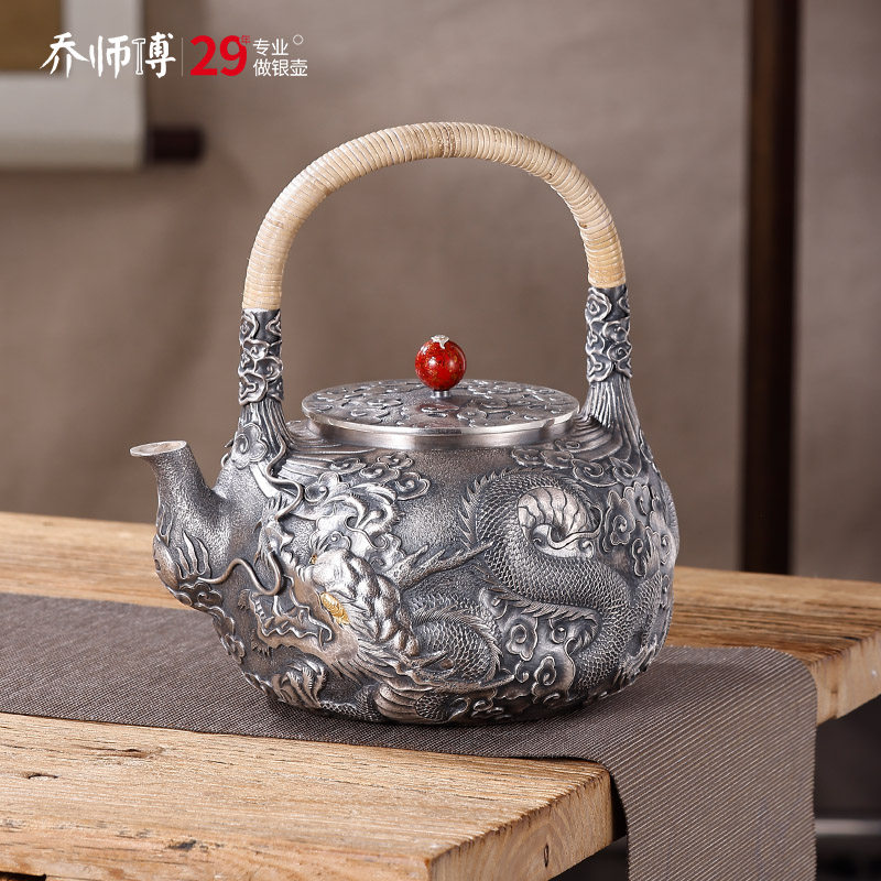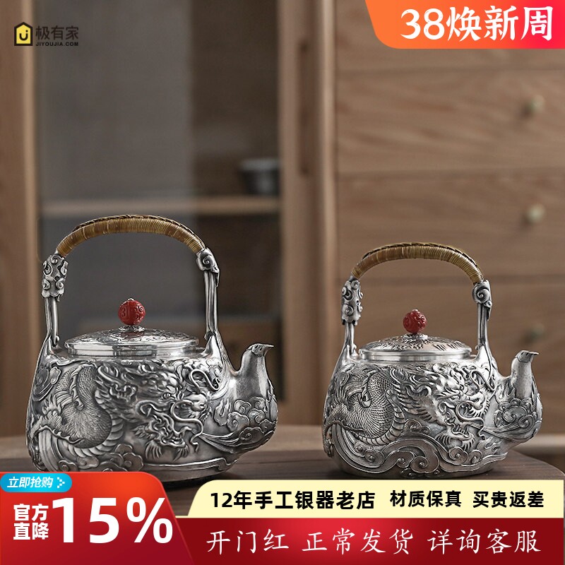 银壶纯银999烧水壶纯手工满雕一张打日式一体壶家用煮茶壶 攫龙