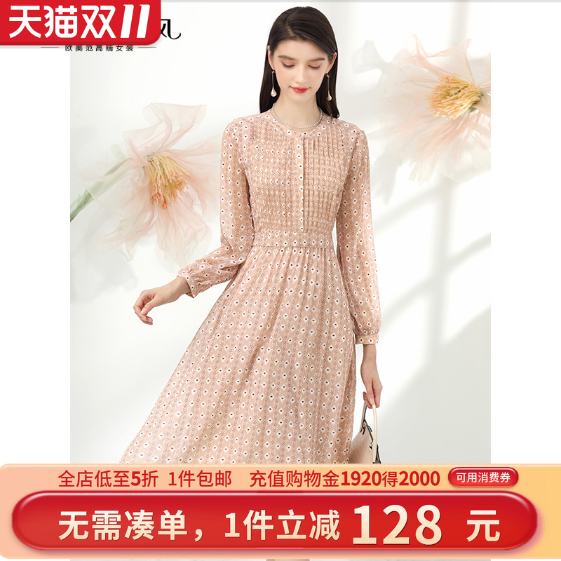 芭依璐2025秋冬新款连衣裙长袖碎花雪纺修身显瘦气质裙子收腰显瘦