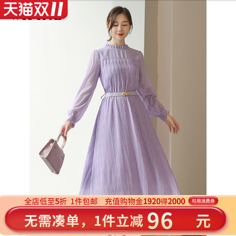 未风紫色雪纺连衣裙女秋2025年秋季新款女装法式收腰长袖遮肚裙子