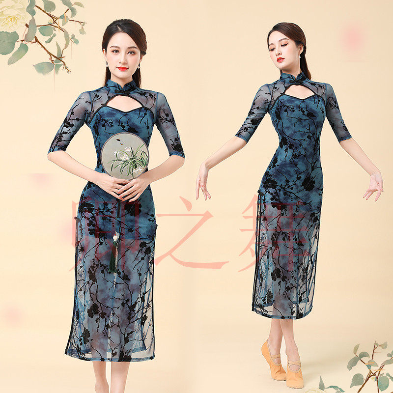 中国古典民族风透视植绒复古碎花连衣裙镂空性感七分袖长旗袍潮流
