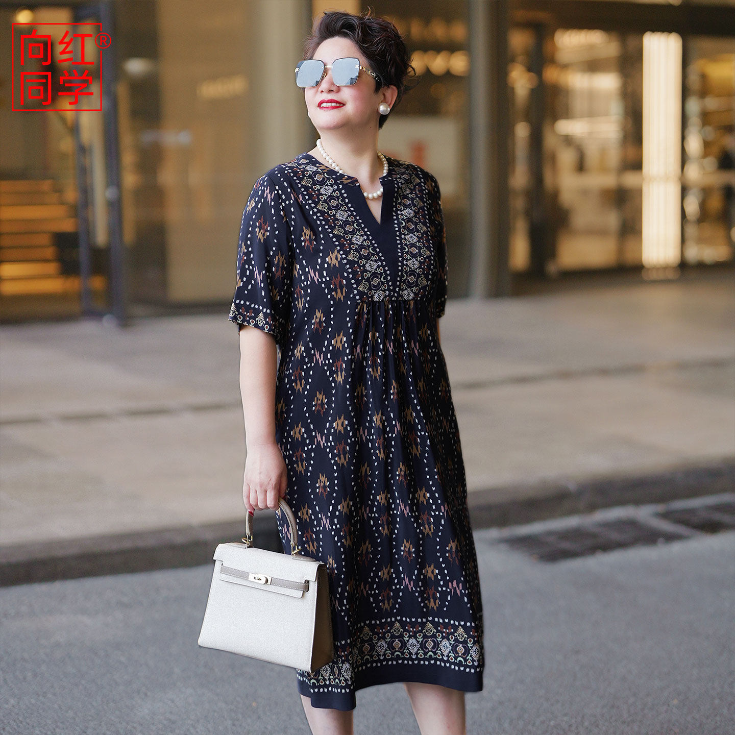 向红同学大码连衣裙夏女2026新款民族风真丝桑蚕丝印花长裙子0392