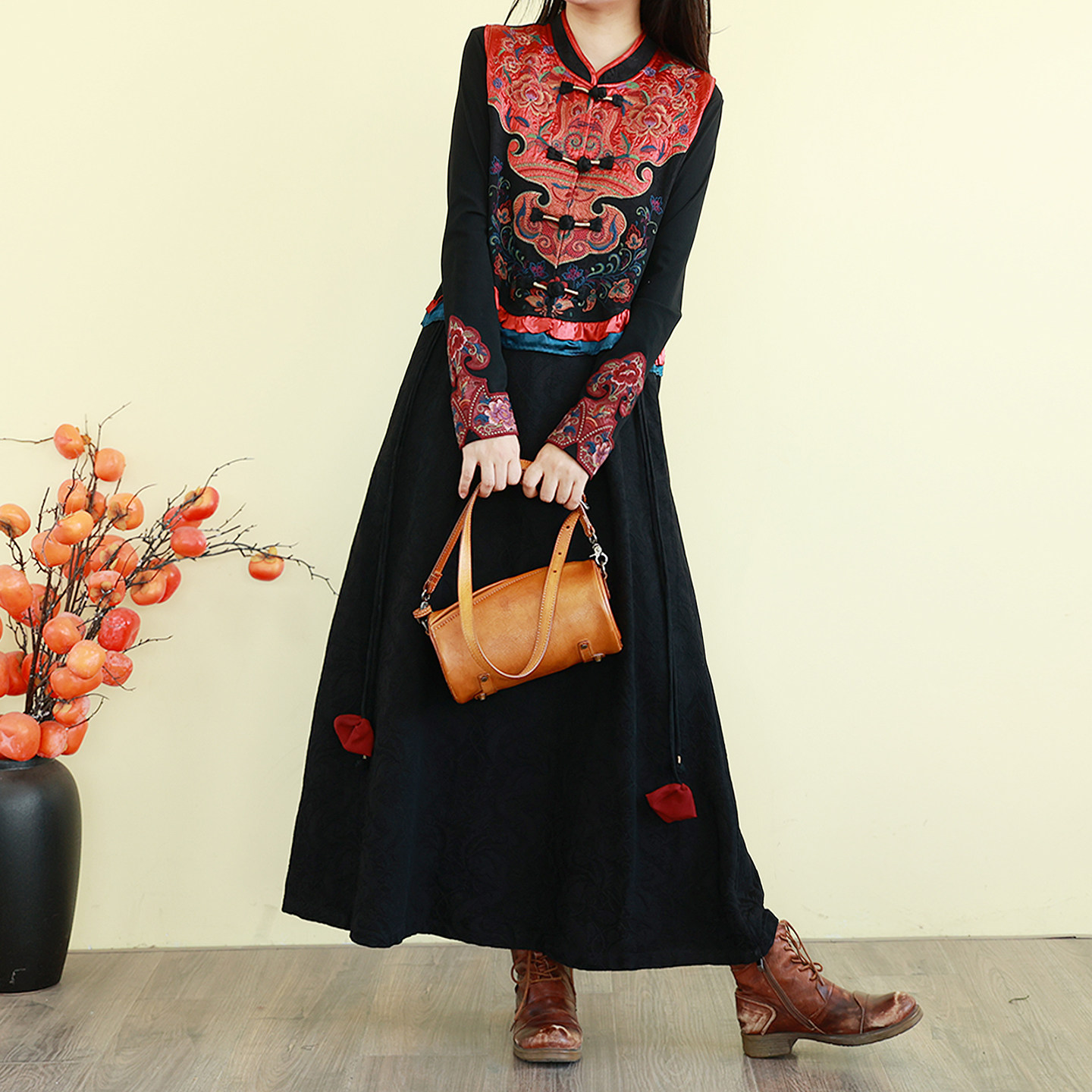 复古民族风棉麻加绒连衣裙冬季长款立领刺绣改良旗袍裙显瘦长裙子