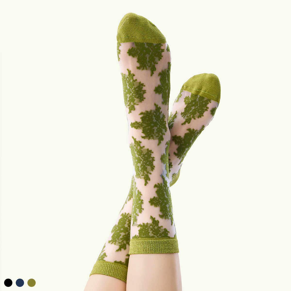 袜say 森系剪影印花立体浮雕透肤女中筒袜玻璃水晶亮光丝袜堆堆袜