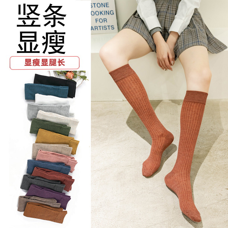 过膝袜子女日系纯棉防滑春秋高筒袜学院风显瘦二杠长筒袜堆堆袜套