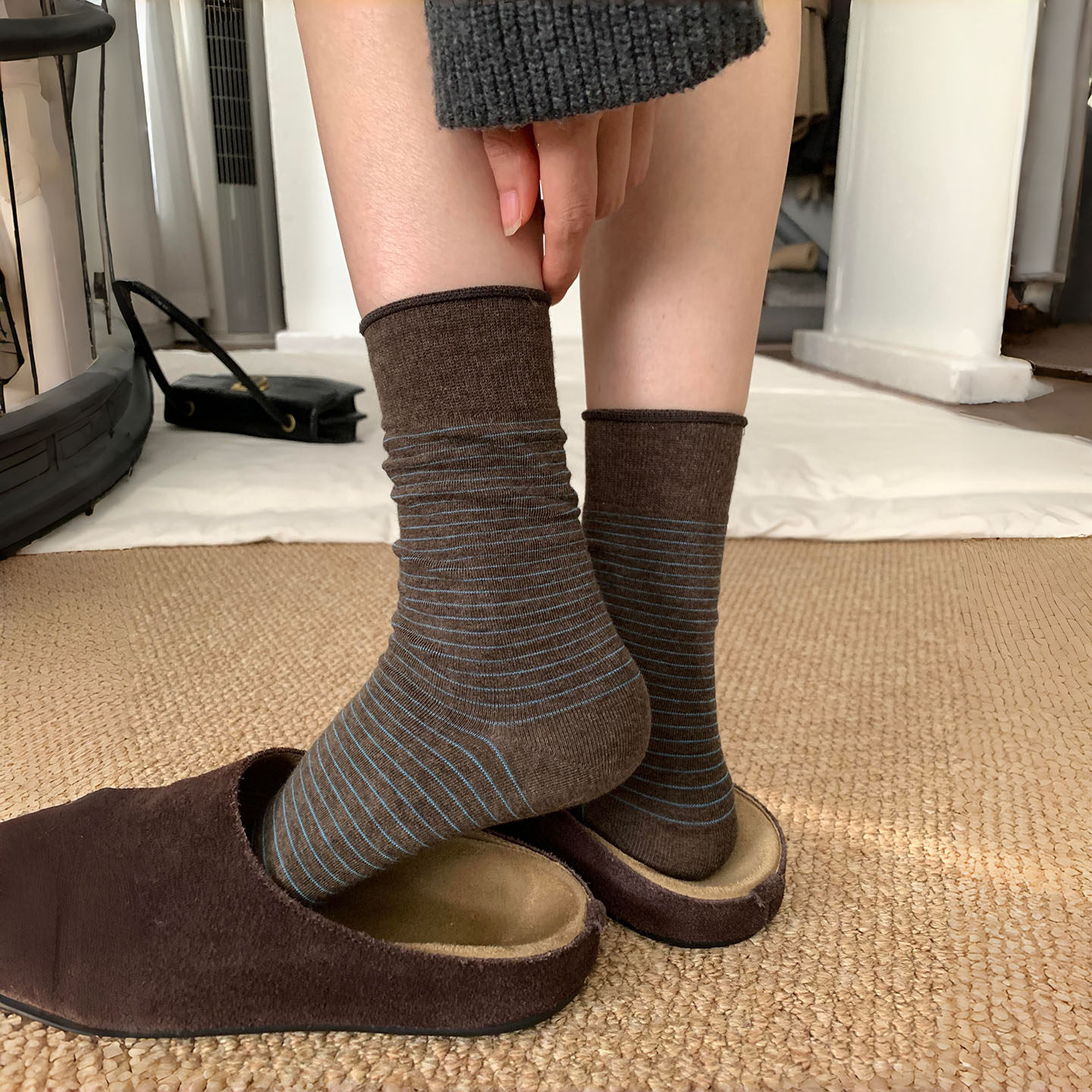 咖色复古细条纹袜子女中筒秋冬季棉袜堆堆袜卷边日系长袜配勃肯鞋