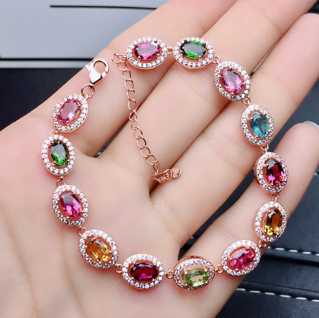 天然巴西碧玺手链特惠 糖果色碧玺手链 石4*6mm925银镀玫瑰金