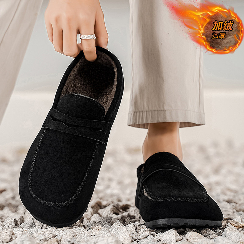 冬季新款加绒保暖真皮一脚蹬休闲鞋软底舒适豆豆鞋懒人鞋潮流男鞋