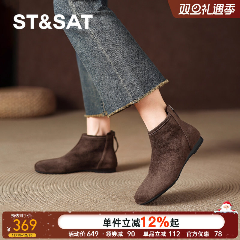 星期六羊绒短靴子女2025年秋冬季新款通勤复古短筒瘦瘦靴平底女靴