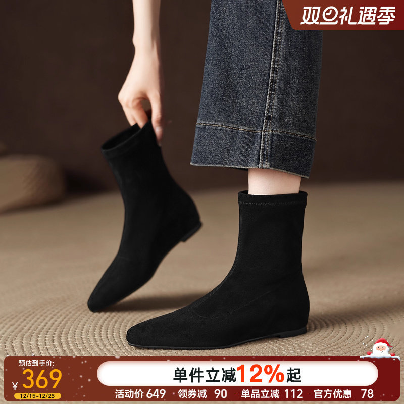星期六黑色短靴女秋冬2025新款复古绒面靴子气质尖头瘦瘦靴平底靴