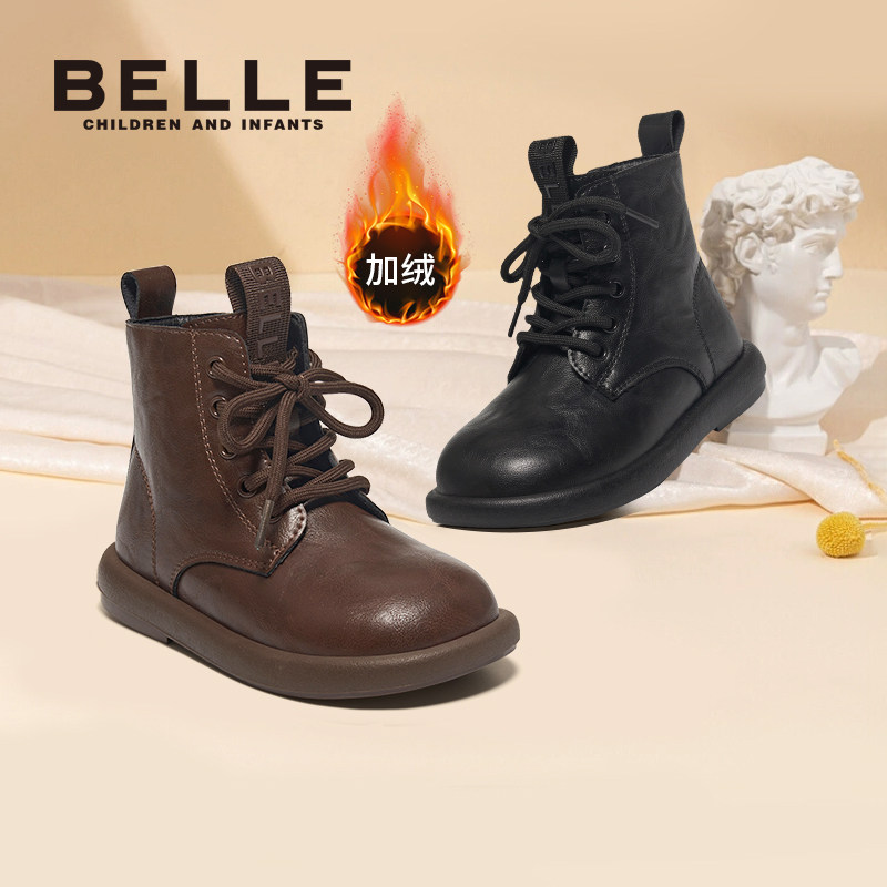 百丽童鞋女童马丁靴秋冬新款复古男童皮鞋大童加绒宝宝儿童短靴子