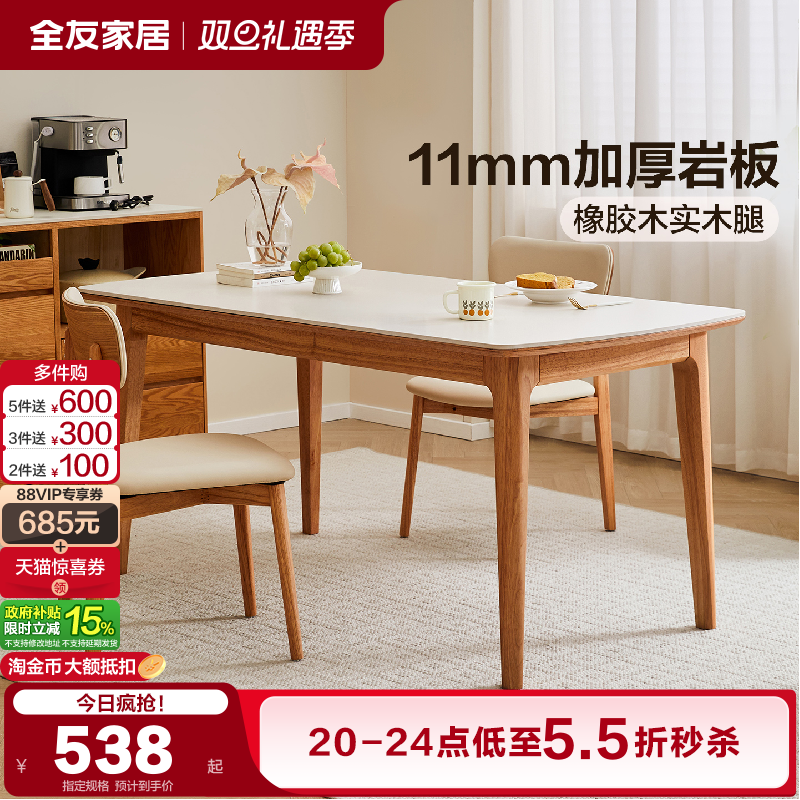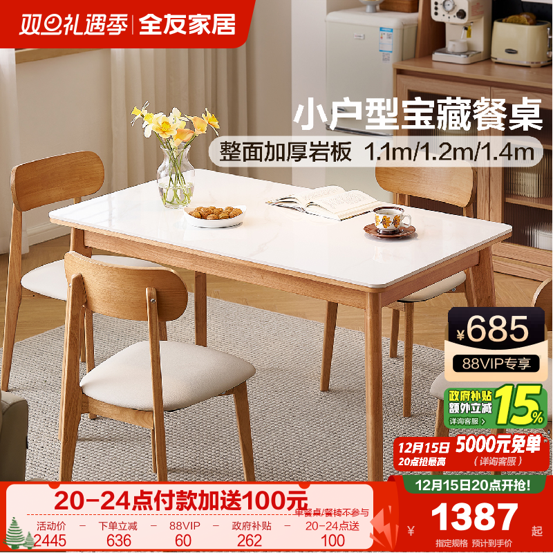 全友家居北欧原木风岩板餐桌新款小户型客厅家用长方形饭桌椅组合
