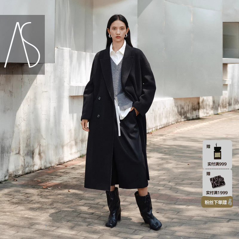 AS双面呢大衣女25冬季新款韩版茧型戗驳领双排扣长款羊毛呢外套