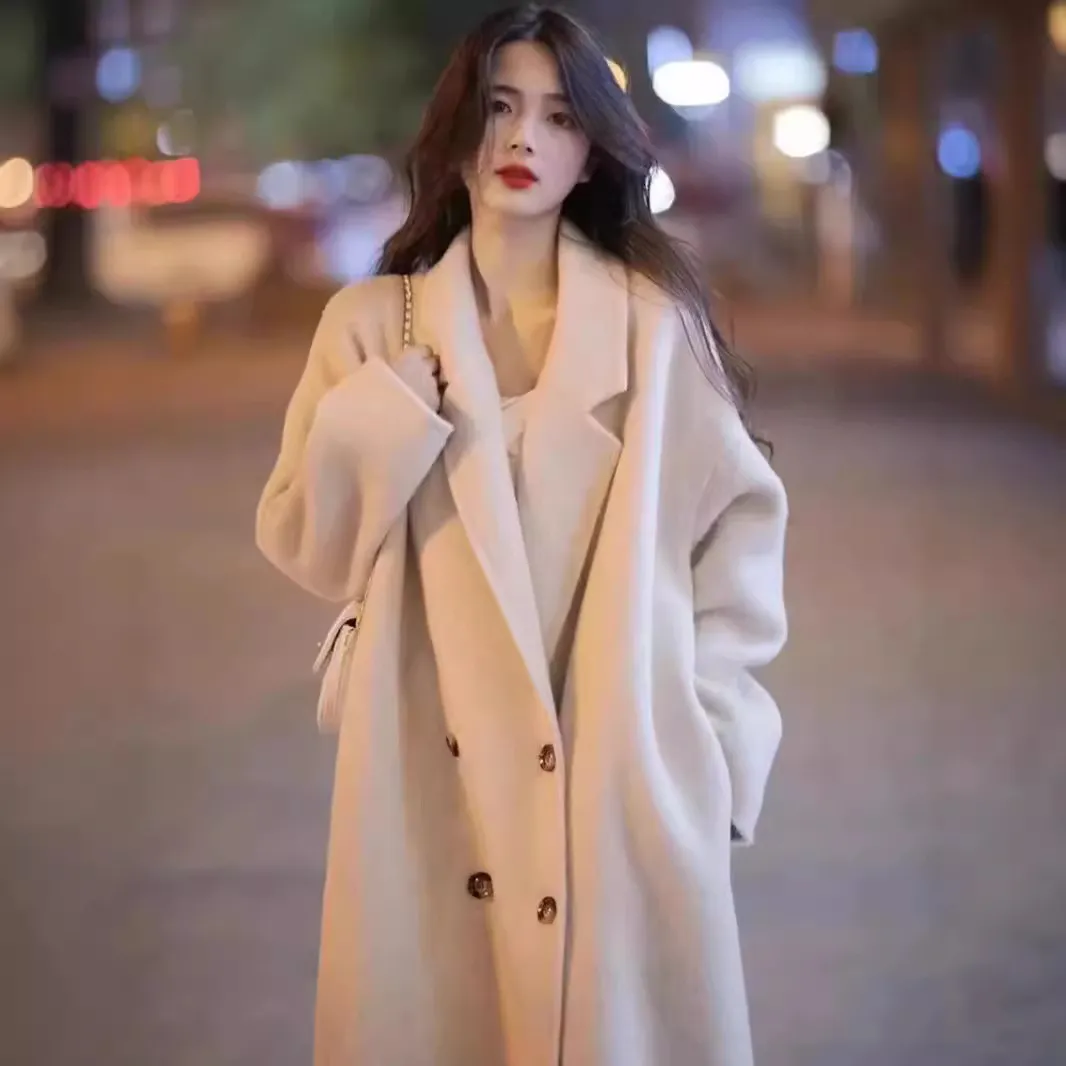 2025秋冬季新款韩版羊毛呢外套加厚大翻领白色中长款茧型呢子大衣