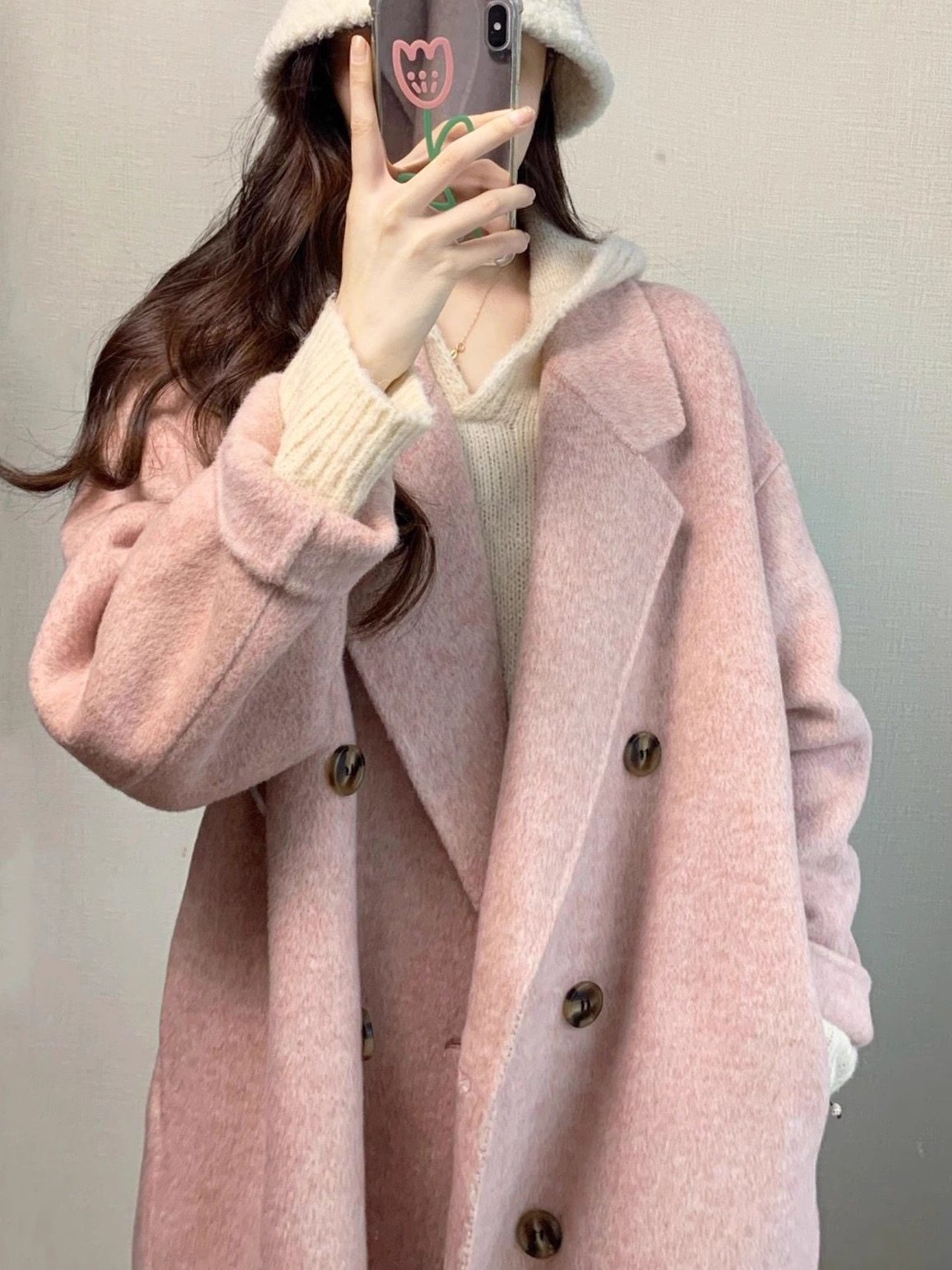 粉色双面呢大衣女中长款小个子宽松茧型韩版羊毛呢子外套秋冬新款