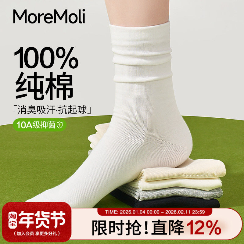 10A抑菌纯棉袜子女款秋冬季防脚气防臭中筒堆堆袜白色无骨月子袜