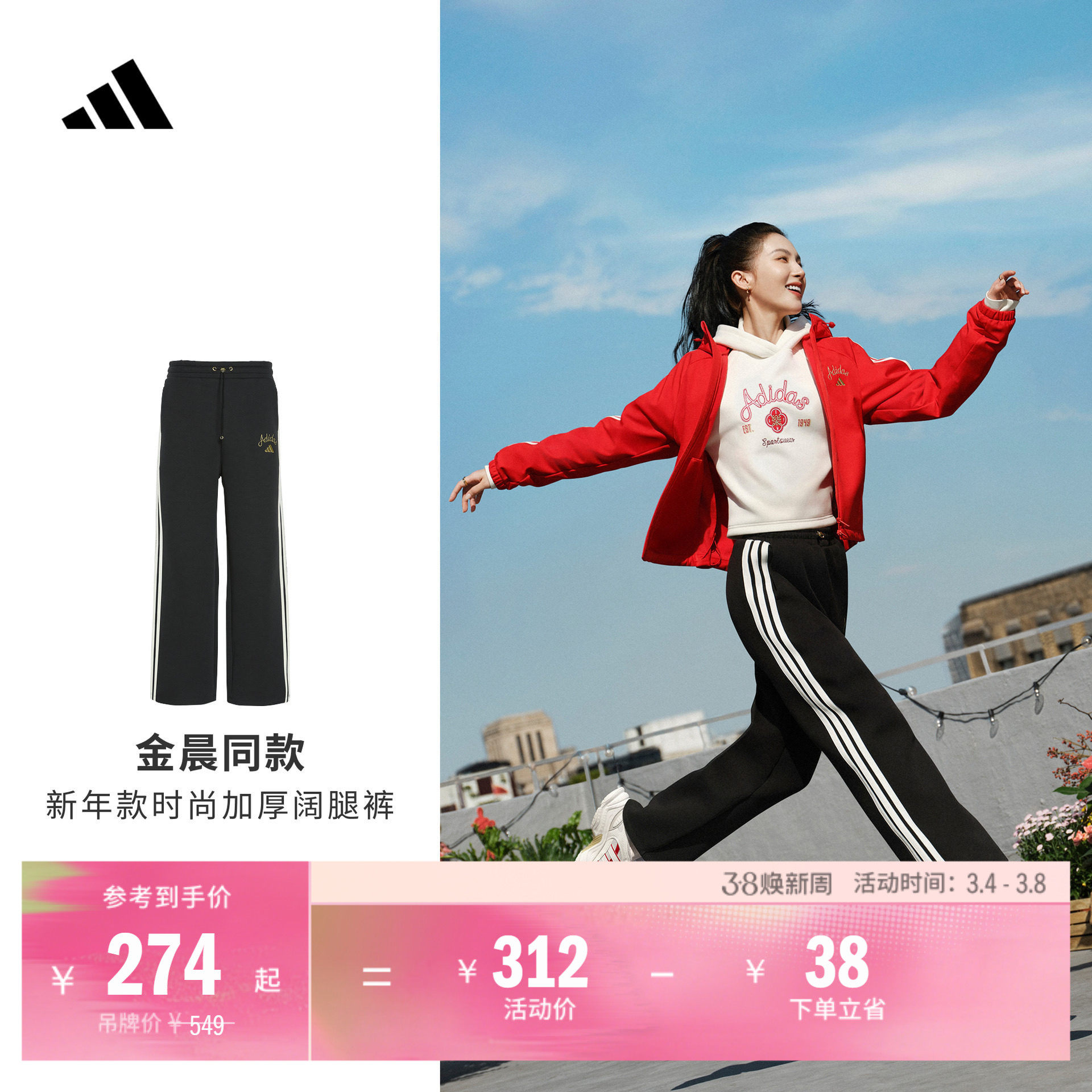 金晨同款加厚时尚休闲高腰运动阔腿裤女秋冬adidas阿迪达斯轻运动