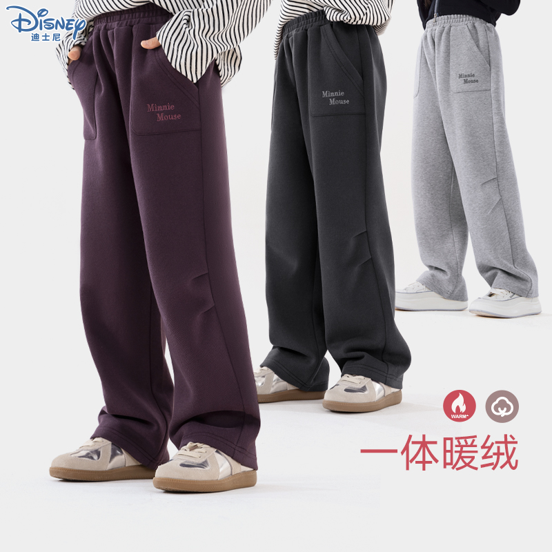 迪士尼女童裤子25秋冬儿童运动裤卫裤休闲直筒工装裤一体绒加厚款